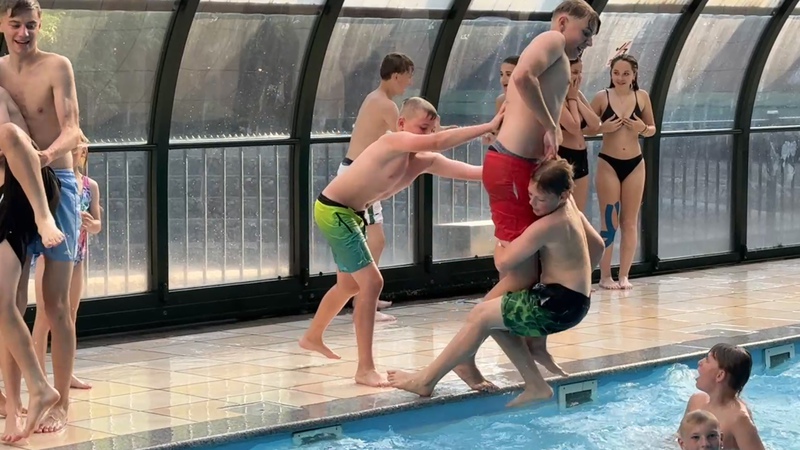 Nach dem Einzug wurden die Regeln im Camp von den Teamern erklärt. Nach dem Abendessen ging es für die meisten ins Schwimmbad, während andere Fußball oder Tischtennis spielten.
